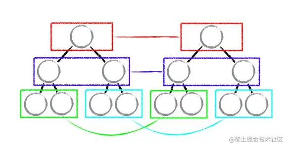 - 如果父节点的状态发生变化,重新渲染所有的子节点。如果一个组件的状态改变了,React 会渲染所有子组件,即使子组件没有被修改。如图所示,React 只会对相同颜色的 DOM 节点进行比较。为了防止不必要的组件的重新渲染,我们可以使用shouldComponentUpdate。