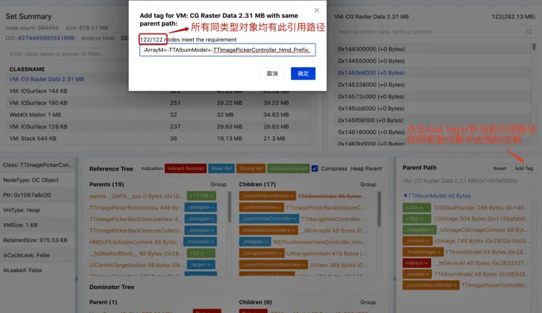 Add Tag来判断当前选中的引用路径在同类对象中出现过多少次。 - 确认有问题的引用路径之后再判断究竟是哪个业务模块发生的问题。