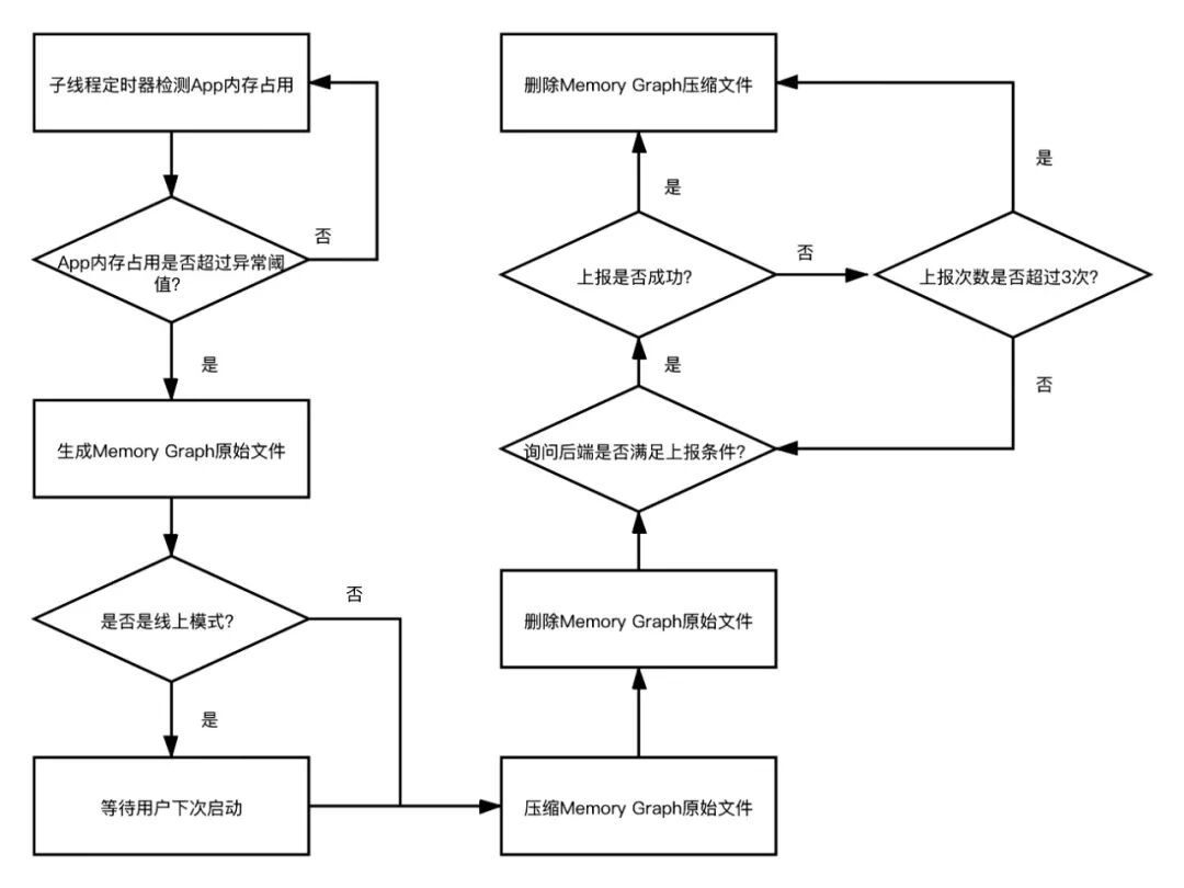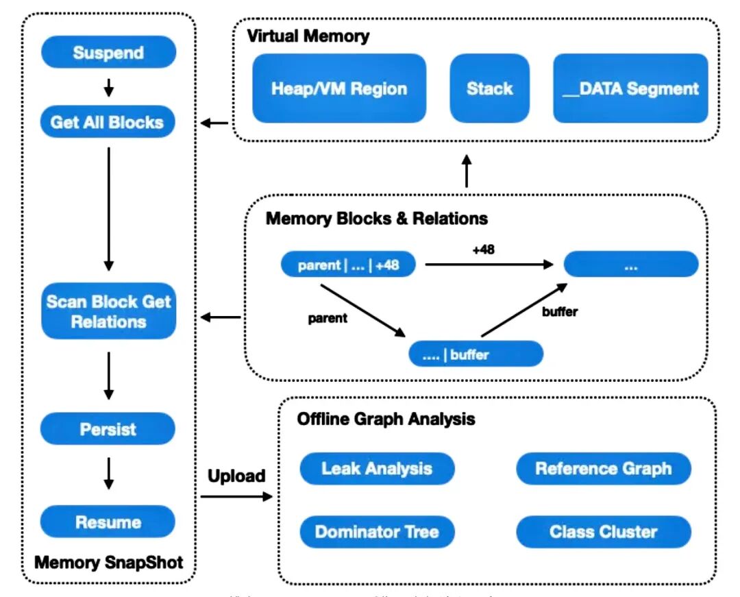 我们在 App 内存到达设定值后采集 App 当时的内存节点和引用关系,然后上传至远端进行分析,可以精准的反映 App 当时的内存状态,从而定位问题,总的流程如下: