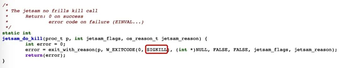 翻阅XNU源码的时候我们可以看到在Jetsam机制终止进程的时候最终是通过发送SIGKILL异常信号来完成的。
