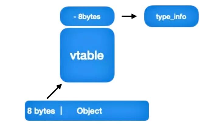 type_name string- 类名对应的常量字符串,存储在__TEXT/__RODATA段的__const section中。type_info- 存放在__DATA/__DATA_CONST段的__const section中。vtable- 存放在__DATA/__DATA_CONST段的__const section中。