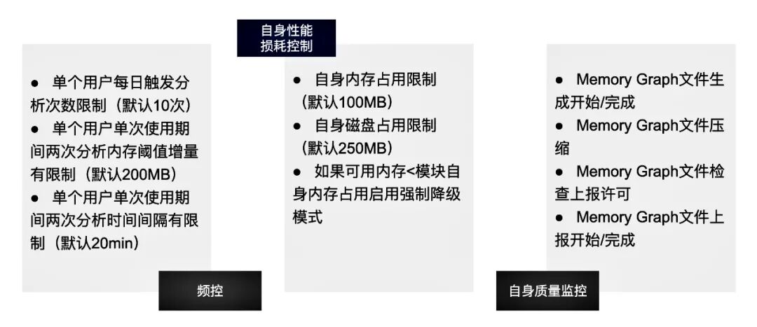 为了严格控制性能损耗,线上 Memory Graph 模块会应用以下策略,避免太频繁的触发打扰用户正常使用,避免自身内存和磁盘等资源过多的占用: