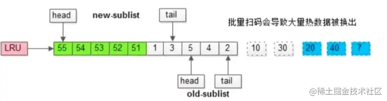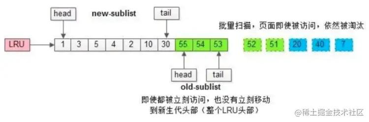 这样下来,大量的数据页都会被加载到新生代的头部中,但是可能只会被访问一次,而真正的热数据被大量挤出