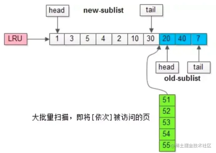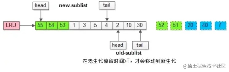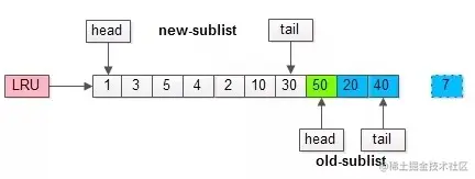 - 将LRU分为两部分即新生代【newSublist】和老生代【oldSublist】