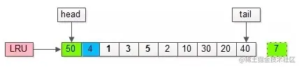 页号为50的页原来不在缓冲池里面,所以需要把页号为50的页放到LRU头部,同时淘汰尾部页号为7的页。