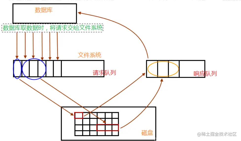 数据库在请求数据的时候,会将读请求交由文件系统,放入到请求队列中去。相关进程就会从请求队列中将读请求取出,根据需求到相关数据区(内存、磁盘)去读取数据,取出数据并放入到响应队列中去,最后数据库就会从响应队列中将数据取走,完成一次数据读操作过程。