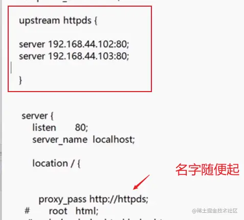 注意:upstream 和server是同级别的。