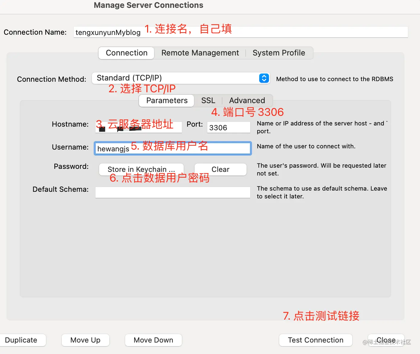 以上四步完成后,可以使用数据库管理工具测试连接,这里使用MySQLWorkbench测试,按照以下界面填写信息,测试连接。