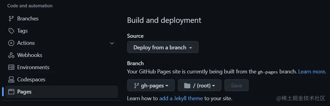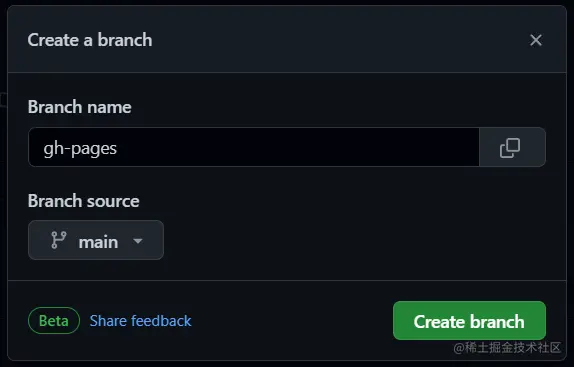 在项目的远程仓库中,创建一个新的分支 gh-pages (也可以是其他名字):