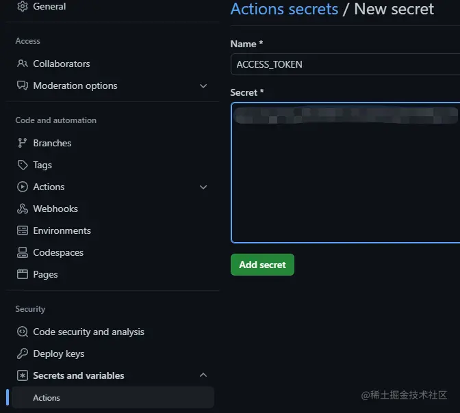 生成一个合适的 access token ,并将它设置到项目仓库的 secrets 中,以方便我们在 actions 中调用,并保证敏感信息不暴露给其他用户: