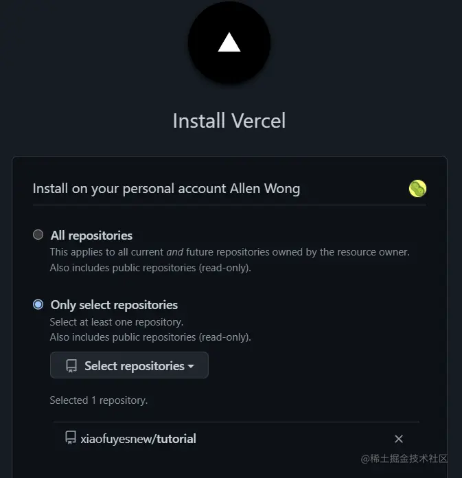 在控制台创建一个新项目,如果没有在 Github 中没有安装 Vercel 应用,会弹出如下图所示的弹窗: