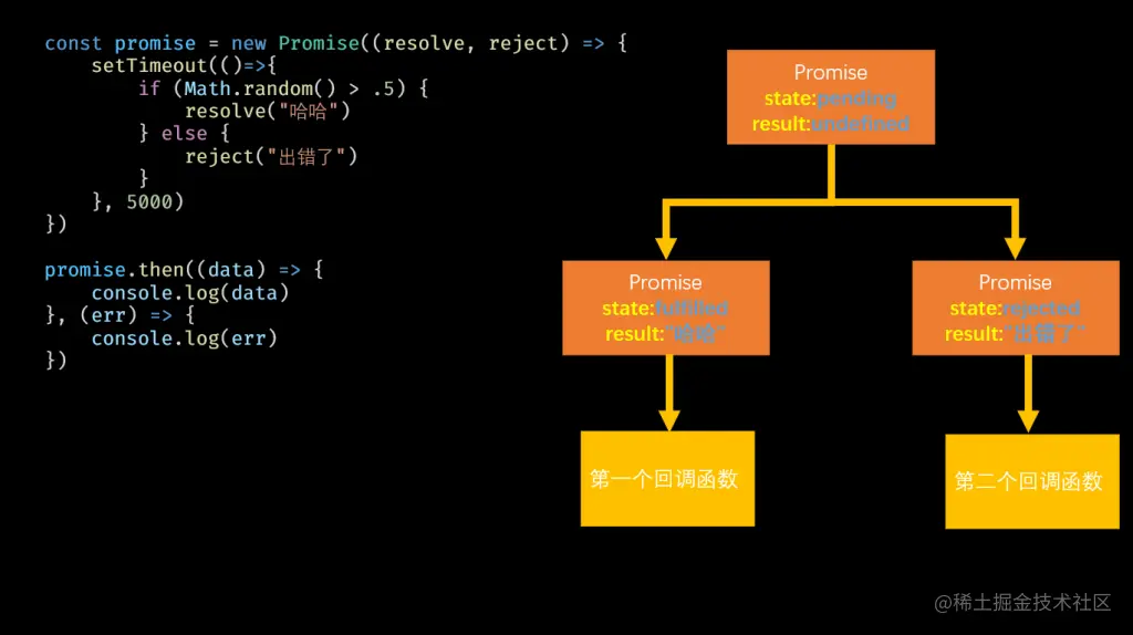 上例中通过setTimeout实现了一个异步调用,定时器会在10秒后执行,并调用resolve将”哈哈”存储到Promise中。现在你应该能够理解为什么Promise有这么一个奇怪的存储值的方式了吧?