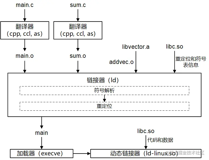 - 重定位main1中所有对libc.so和libvector.so定义的符号的引用; 最后,动态链接器将控制传递给应用程序。从这个时刻开始,共享库的位置就固定了,并且在整个程序执行的过程中都不会改变。