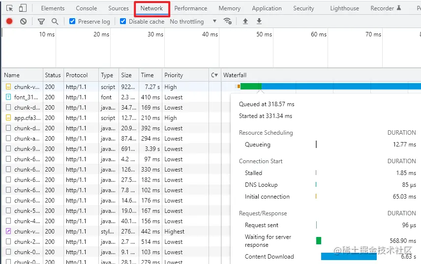 另外就是 watefall , 瀑布流 。鼠标悬浮在上面,可以查看请求的各阶段时间点。