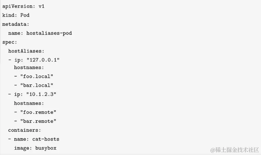 当一个Pod被创建后,默认情况下,hosts文件只包含IPv4和IPv6的样板内容,例如localhost和主机名称。除了默认的样板内容,我们可能有向Pod的hosts文件添加额外的条目的需求,Kubernetes提供downward API,支持用户通过PodSpec的HostAliases字段添加这些自定义的条目,如下所示: