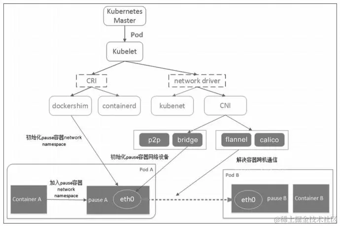 (4)CNI主要负责容器的网络设备初始化工作,创建容器的eth0并分配IP,Pod内其他容器就使用这个IP与其他容器或节点进行通信。