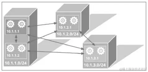 在Kubernetes的网络模型中,每台服务器上的容器有自己独立的IP段,各个服务器之间的容器可以根据目标容器的IP地址进行访问,如图3-4所示。