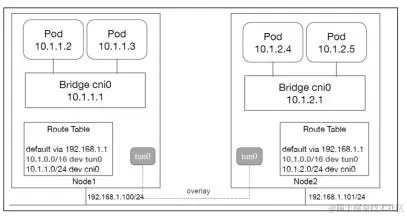 和bridge网络类似,Pod同样接在Linux网桥上,目的地址落在本机Pod网段的网络包同样发给Linux网桥cni0。不同的是,这次是直接发给本机的tun/tap设备tun0,而tun0就是overlay隧道网络的入口。