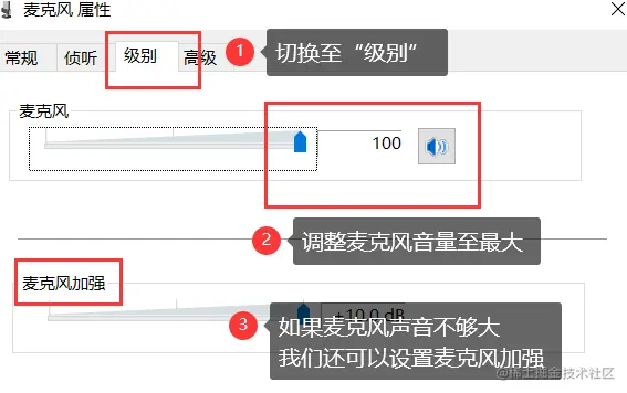 步骤3: 在弹出的【麦克风属性】窗口,切换到【级别】界面,调整下面麦克风的音量,把声音拉到最大。如果声音还是不够大,我们可以在下面设置麦克风加强;