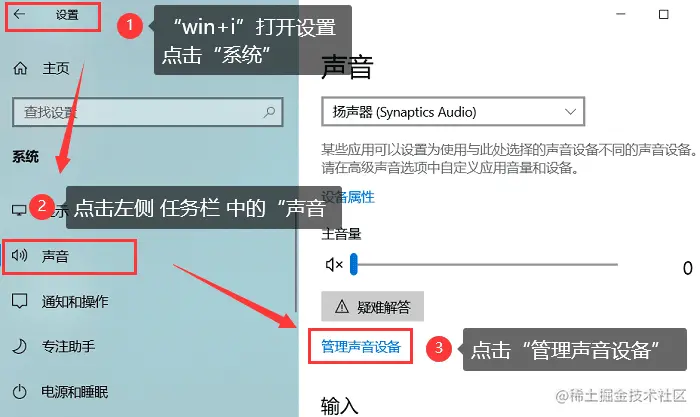 步骤1: 通过组合键【Win+i】打开设置窗口,点击【系统】。在设置界面的左侧,点击【声音】,再选择【管理声音设备】;