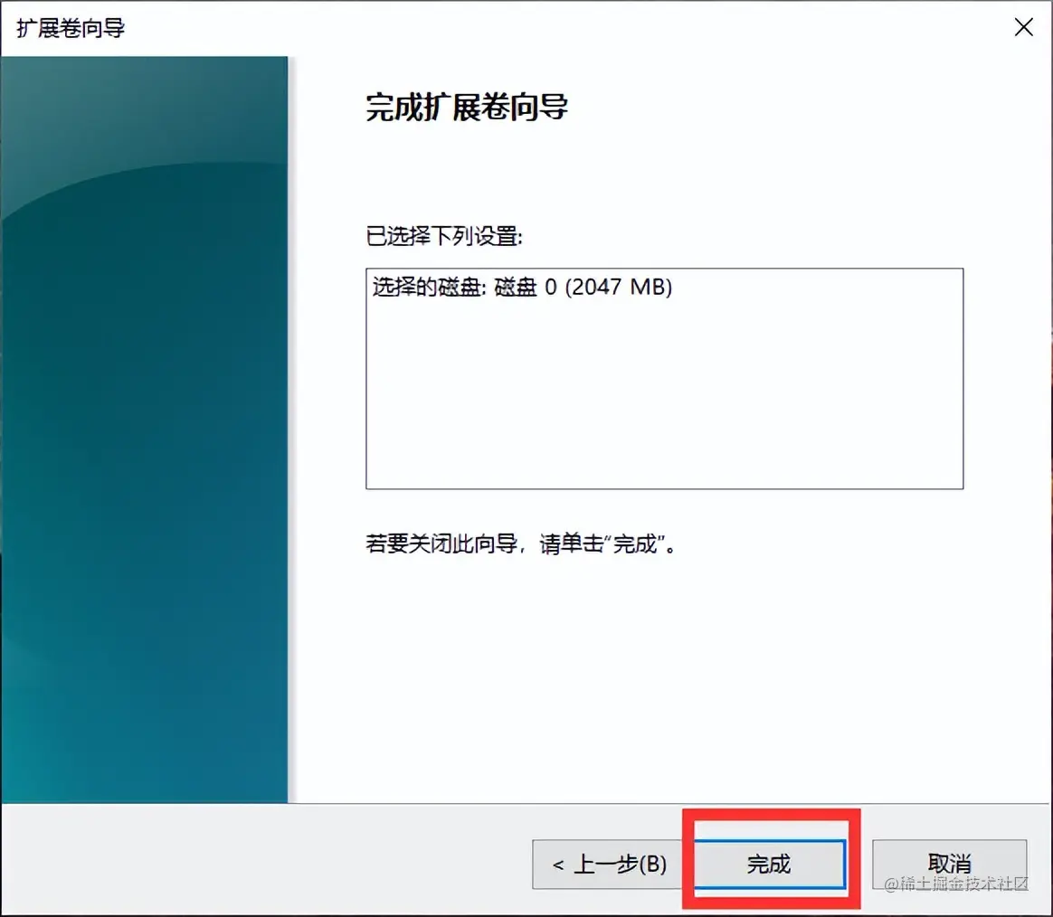 **步骤5:**来到【扩展卷向导】的最后一页后,点击【完成】,即可将分盘进行合并。