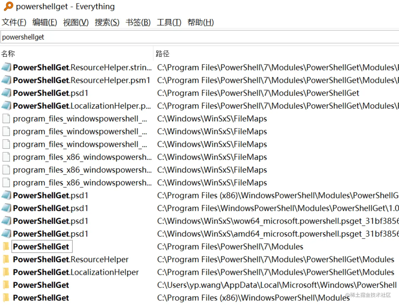 因为Install-Module命令需要PowerShellGet模块,而通过全局搜索"PowerShellGet",发现包含“PowerShellGet.psd1”文件的路径并没有在上面的环境变量中。