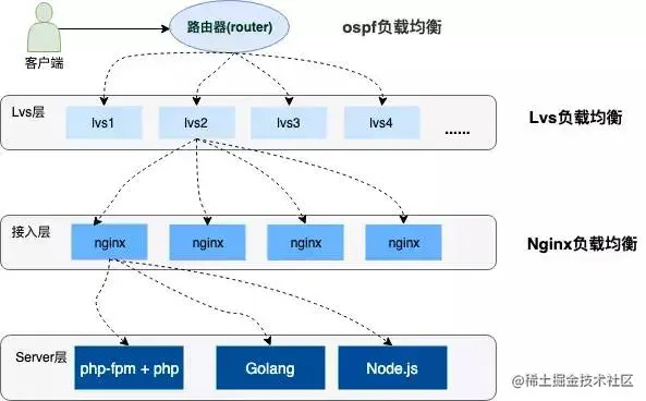 高并发的系统架构都会采用分布式集群部署,服务上层有着层层负载均衡,并提供各种容灾手段(双活机房➊、节点容错、服务器灾备等)保证系统的高可用,流量也会根据不同的负载能力和配置策略均衡到不同的服务器上。下边是一个简单的示意图:
