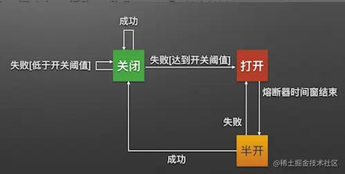 - 当熔断器开关处于打开状态, 经过一段时间后, 熔断器会自动进入半开状态, 这时熔断器只允许一个请求通过. 当该请求调用成功时, 熔断器恢复到关闭状态. 若该请求失败, 熔断器继续保持打开状态, 接下来的请求被禁止通过.