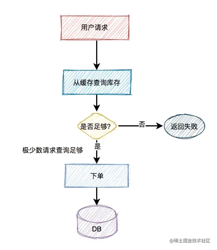 由于大量用户抢少量商品,只有极少部分用户能够抢成功,所以绝大部分用户在秒杀时,库存其实是不足的,系统会直接返回该商品已经抢完。