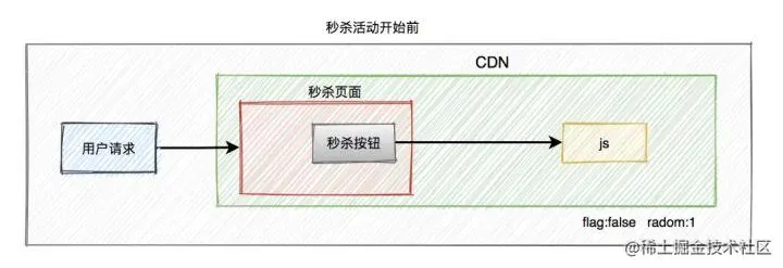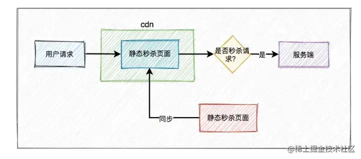 为了性能考虑,一般会将css、js和图片等静态资源文件提前缓存到CDN上,让用户能够就近访问秒杀页面。