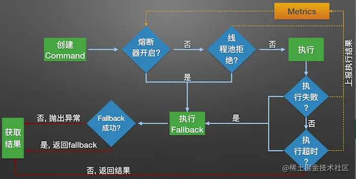 - 若服务执行超时, 则执行降级服务getFallback方法, 并将执行结果上报Metrics更新服务健康状况.