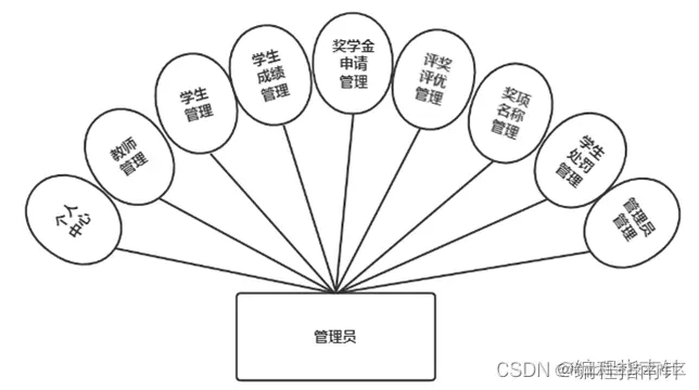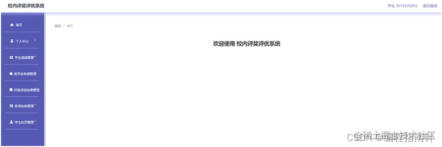 - 学生;学生在校内评奖评优系统中主要拥有的功能有:个人中心、学生成绩管理、奖学金申请管理、评奖评优管理、奖项名称管理、学生处罚管理