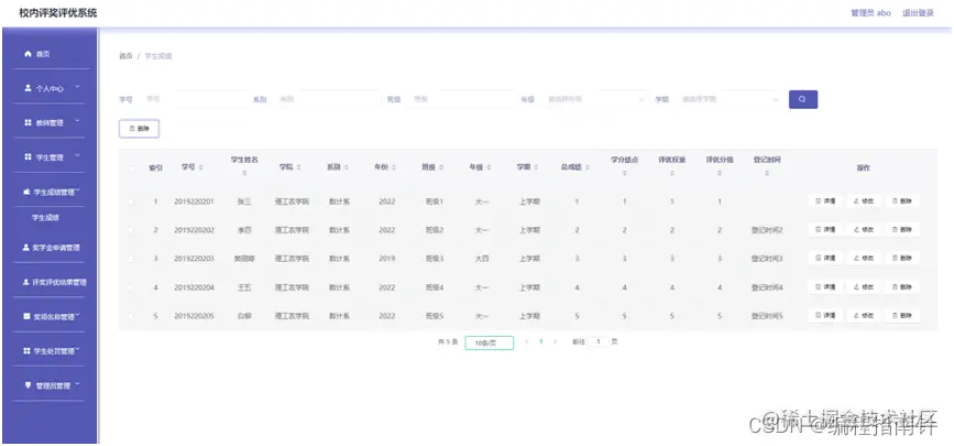 学生成绩管理:在学生成绩管理页面可以对学生成绩进行增删改查等功能,并可以点开详情查看该学生的成绩详情。如图3-5所示。