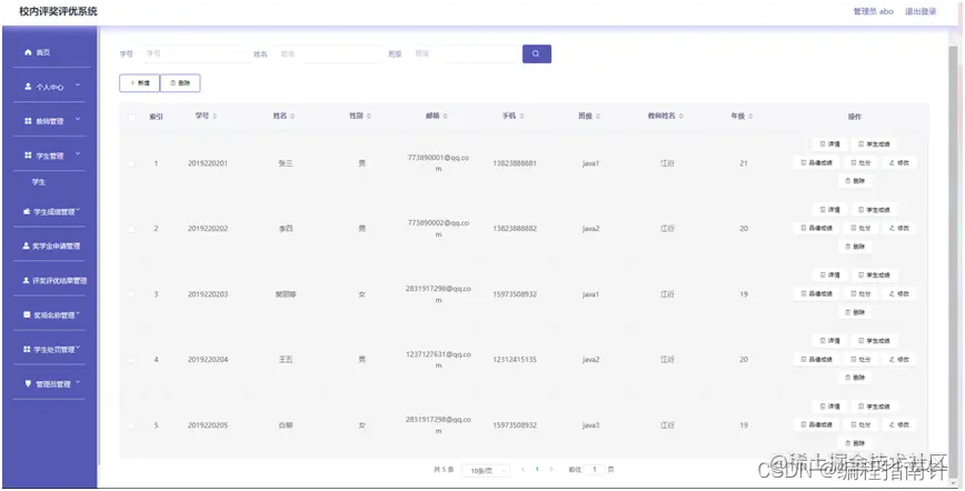 学生管理:在学生管理页面可以对学生进行增删改查等功能,可以点开详情查看该学生的详情信息,查看学生的成绩,并对学生进行处分。如图5-4所示。