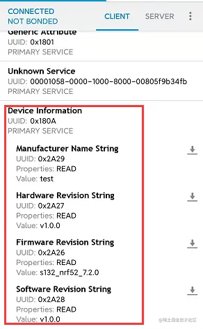 使用手机nRF Connect APP连接设备后查看: