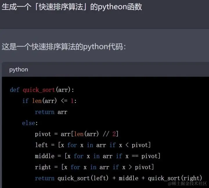 我问:生成一个「快速排序算法」的pytheon函数。我故意把Python打错为pytheon,但这丝毫不影响ChatGPT的发挥。