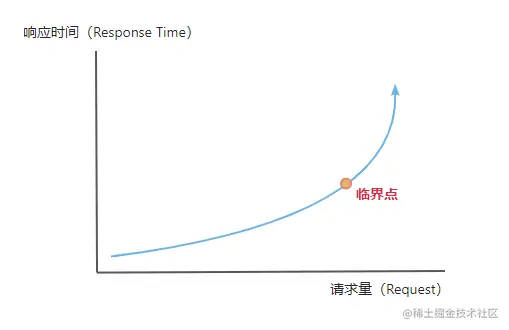 通常情况下,资源使用率并不简单地等于CPU利用率、CPU负载,也包括内存、I/O、服务相关配置不合理造成的瓶颈等等。所有这些资源的瓶颈最终都会表现为响应时间和错误率的增加,所以不论服务有多少资源,我们需要找到一个触及系统资源瓶颈的临界点(如下图所示),在这个点之前,应用的性能表现和访问量是呈线性关系的,一旦访问量超过这个临界点,应用的性能就会明显下降。基于此,我们压测的标准如下: