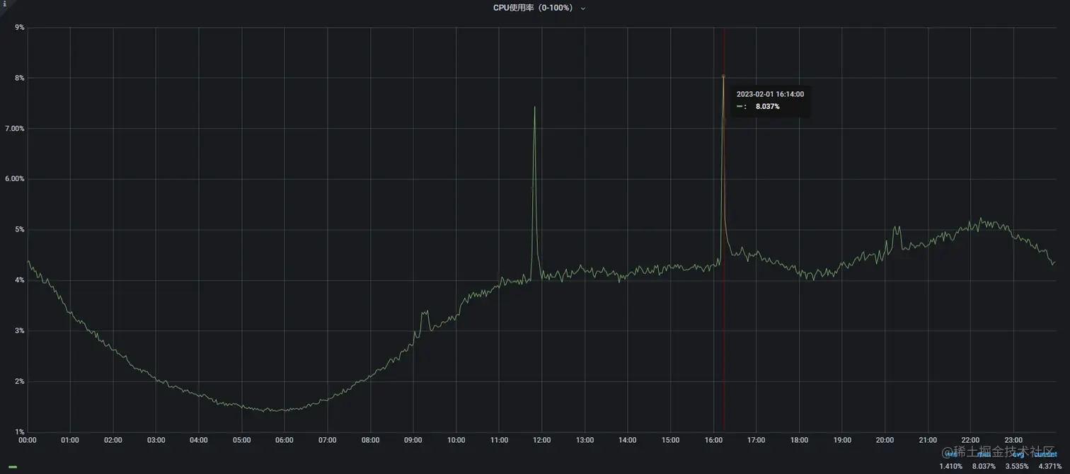 1、服务配置缩减 A服务CPU为4核,内存为8G。如下图所示,单日最高CPU使用率为8%(上限400%),内存使用率72%,在保证服务资源冗余30%的情况下,我们会把服务的CPU配置缩减为2核。