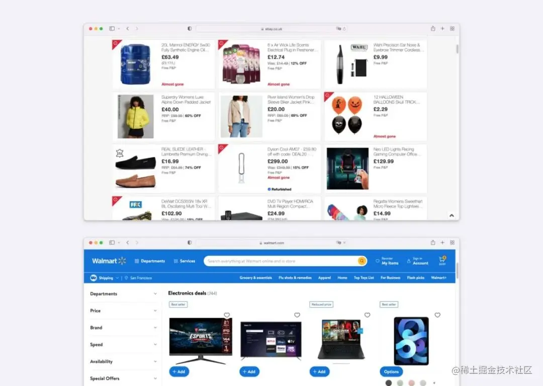 亚马逊、阿里、eBay等电商网站都使用卡片来展示产品。通常,产品卡片由产品图片、标题、价格、折扣和按钮组成,点击卡片跳转到产品详情页。
