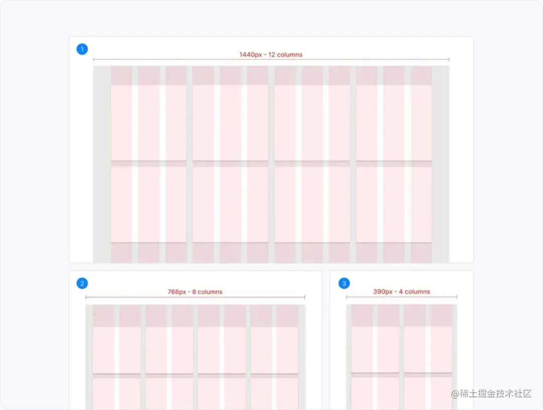 对于不同的显示设备,如pc端、pad端和移动端,采用不同的网格列数和宽度,保持内容在不同屏幕尺寸上做到响应式变化。