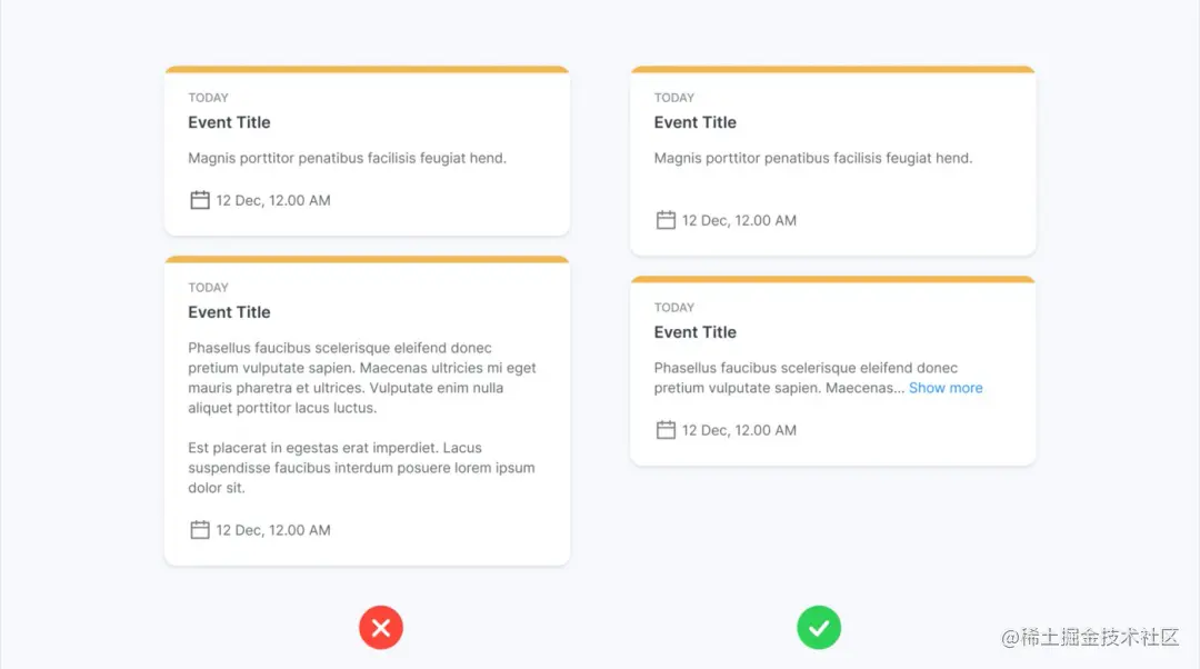 这种情况下,我们需要对卡片设定一个固定的高度,并对展示的内容设定具体的行数,例如规定最多展示两行文字,多出的文字做省略效果。