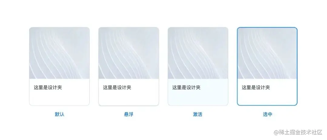 当用户与卡片进行交互时,卡片需要呈现特定的视觉反馈。常见的卡片状态包括默认、悬浮(pc端)、激活、选中等。