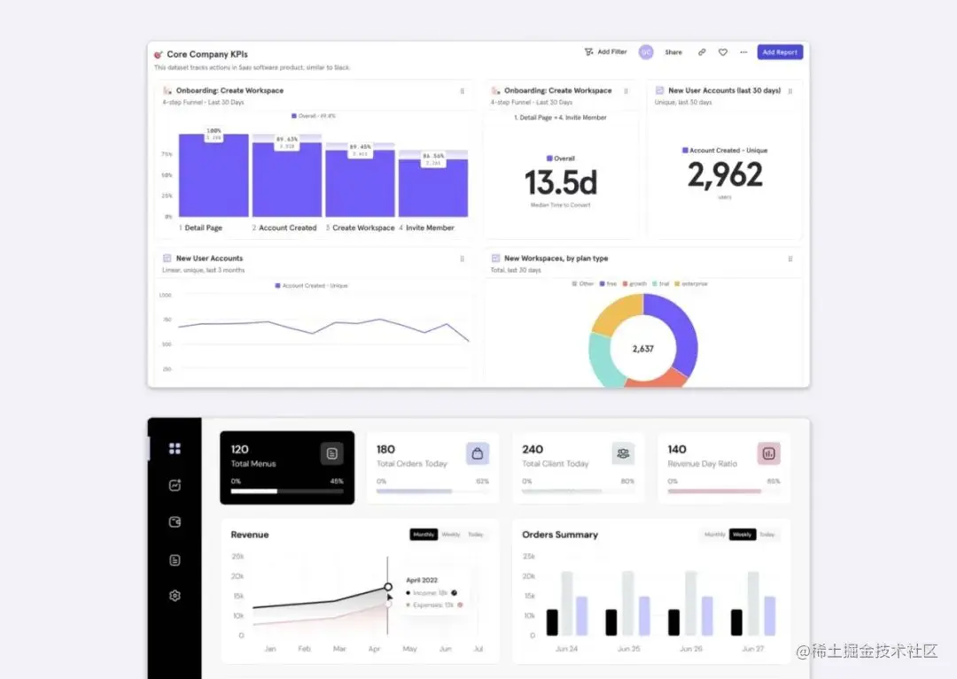 数据看板中展示了如何使用卡片对相关信息进行分组,用户更方便比较和分析界面中的数据。