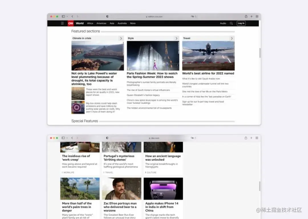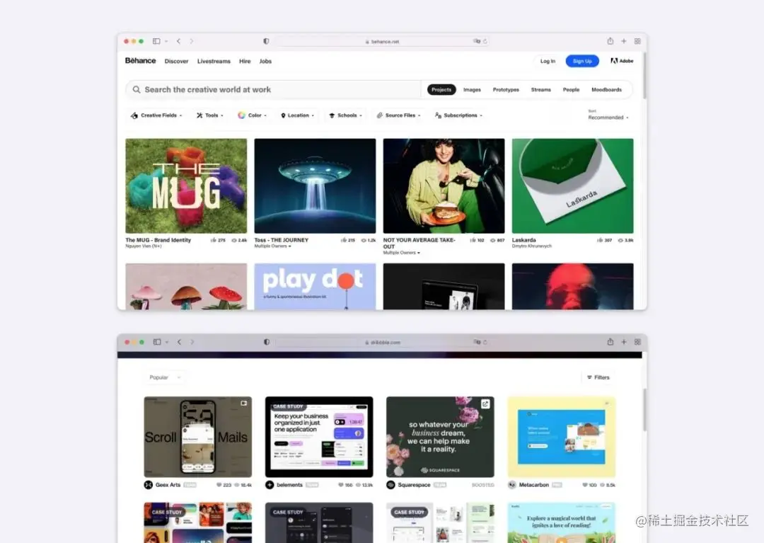 例如Behance、Bribbble等内容平台、BBC等新闻平台,或者Unsplash这类图片网站,都使用基于卡片的布局表示每个内容事,这样用户可以快速浏览、比较和选择想要观看的内容。
