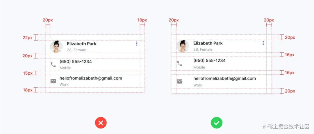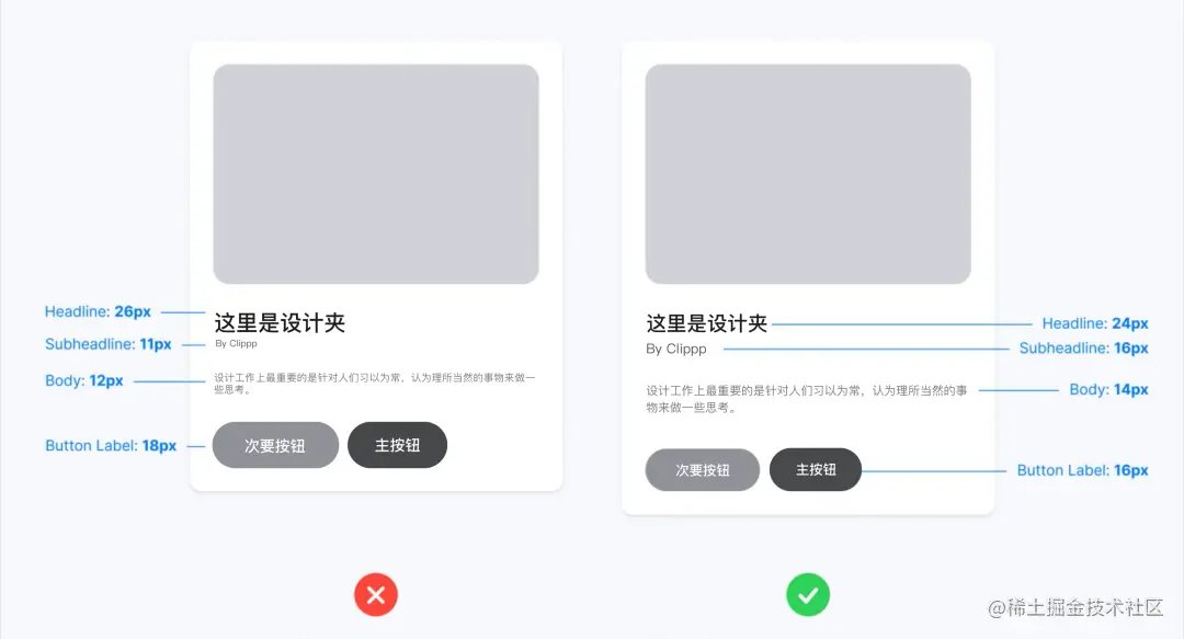 内容可读性由字体的选择和字号的大小决定。例如,下面两个卡片有一样的布局,但右边卡片的内容更有层次感,更容易识别。