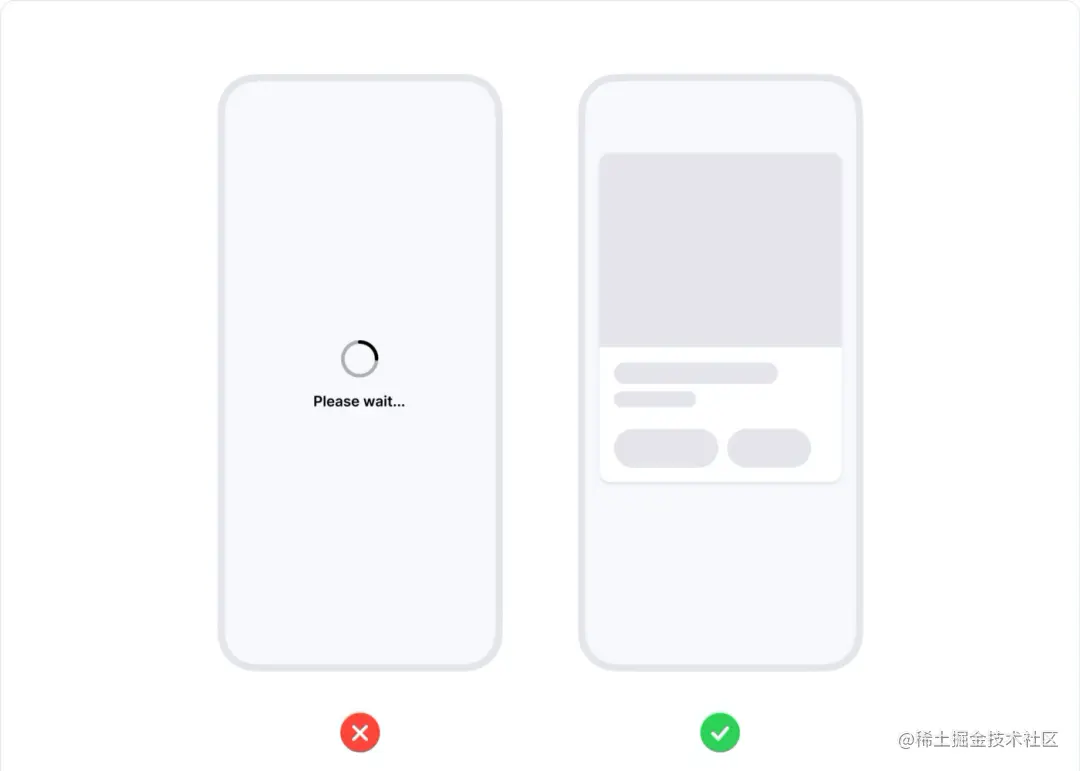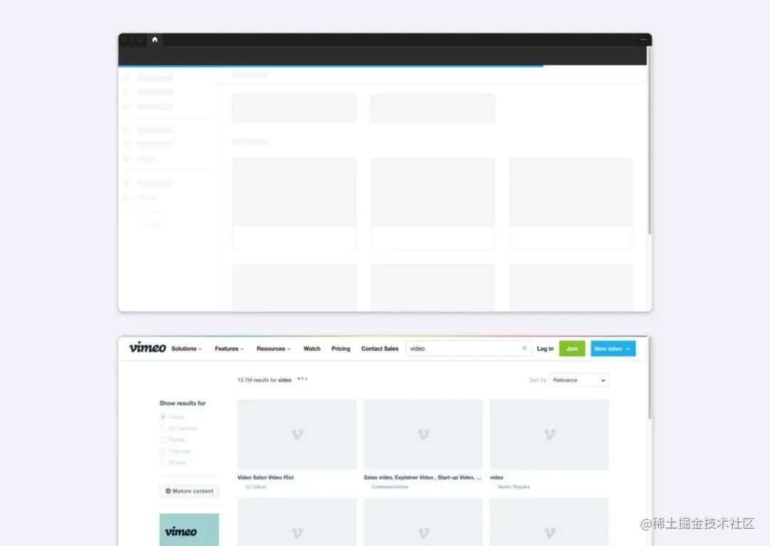 对比下面的两个加载样式能看到,右侧的骨架屏加载样式能让用户知道接下来的页面中会出现卡片,更好地传达内容。