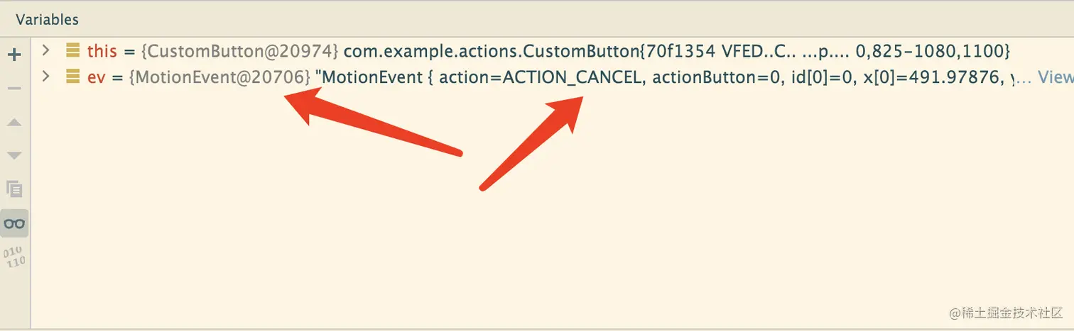 ScrollView的ACTION_MOVE和Button的ACTION_CANCEL,对应的MotionEvent实际上是同一个对象,只不过ScrollView拦截事件冒泡的时候,会将ACTION_MOVE换成ACTION_CANCEL,继续下发: