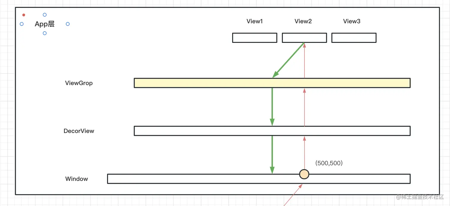 而App层面的传递是向上的,从最底层的Window开始, 传递给DecorView,再是ViewGroup,最终找到目标View。