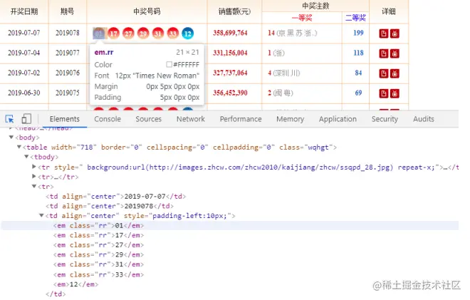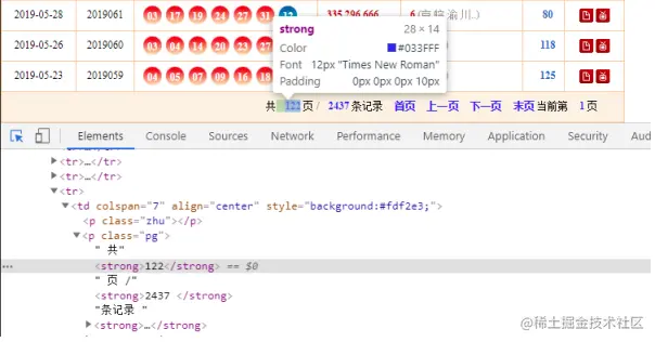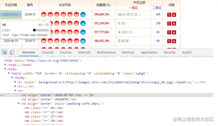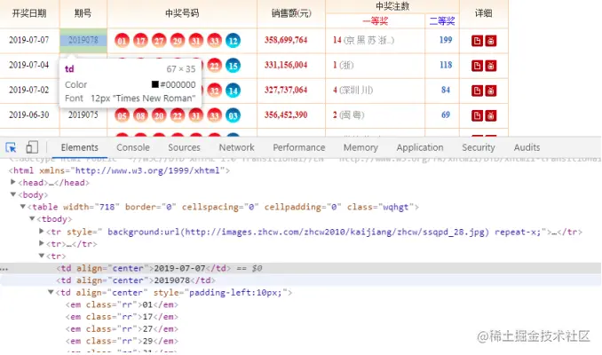 记录下这里的元素信息。 接下来,我们需要抓取每一页中的具体开奖信息。我们继续通过开发者工具分析出每期开奖信息。 我们依次记录下每期的开奖日期对应的元素信息: