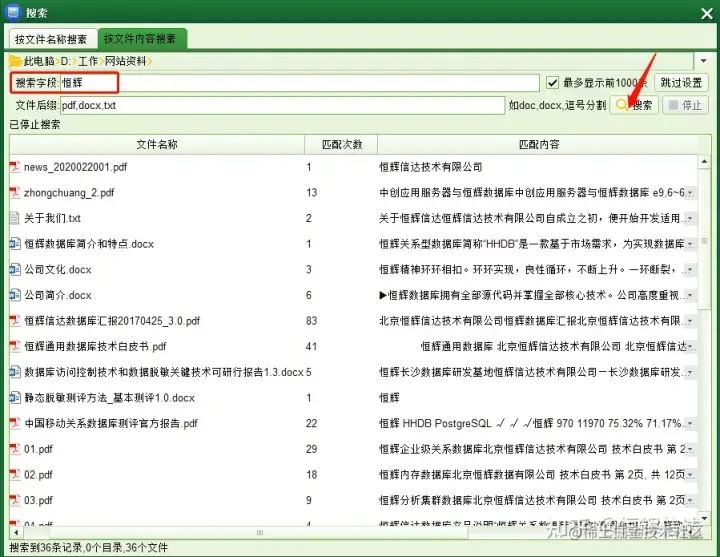 HHDESK文件内文本搜索功能 恒辉信达 2023-02-13 131 阅读1分钟 国产桌面软件HHDESK新开发了一个独有功能:搜索 PDF、Word、文本文件中的内容,想必对于办公人员来说非常方便。 1 如何使用递归搜索功能 下载HHDESK最新版本,在软件首页点击递归搜索 出现如下对话框;在红框标识处填入需要搜索的文本内容,点击搜索即可。 2 使用技巧 1).点击“跳过设置”,会弹出如下对话框,您可根据需求修改默认跳过的文件格式。 2).填写文件后缀,将大量节约搜索时间。